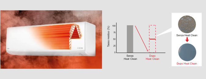 Riscalda lo scambiatore di calore dell’unità interna ad una temperatura di oltre 55°C, asciugando l’umidità residua e neutralizzando contaminanti ed impurità, per una pulizia rapida ed efficace. Agisce anche contro le muffe causa di cattivi odori.
